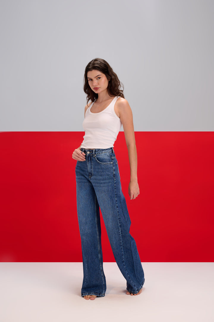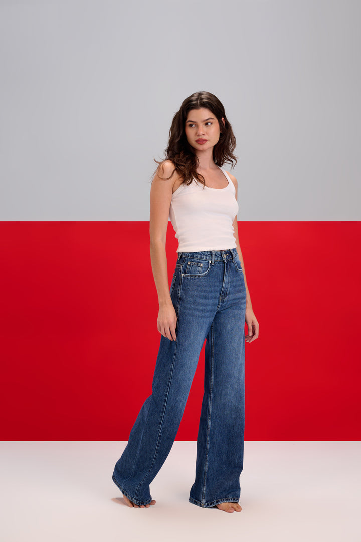 The Flared Leg Jeans feature a high waist and a wider fit than traditional wide-leg jeans, creating a bold, flattering silhouette. Made from 100% cotton denim, they come in vibrant colors. The jeans are true to size, but for a more fitted look, we recommend going one size down.